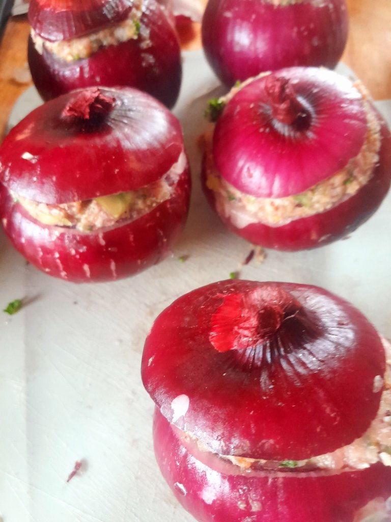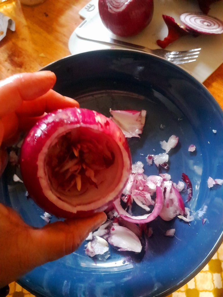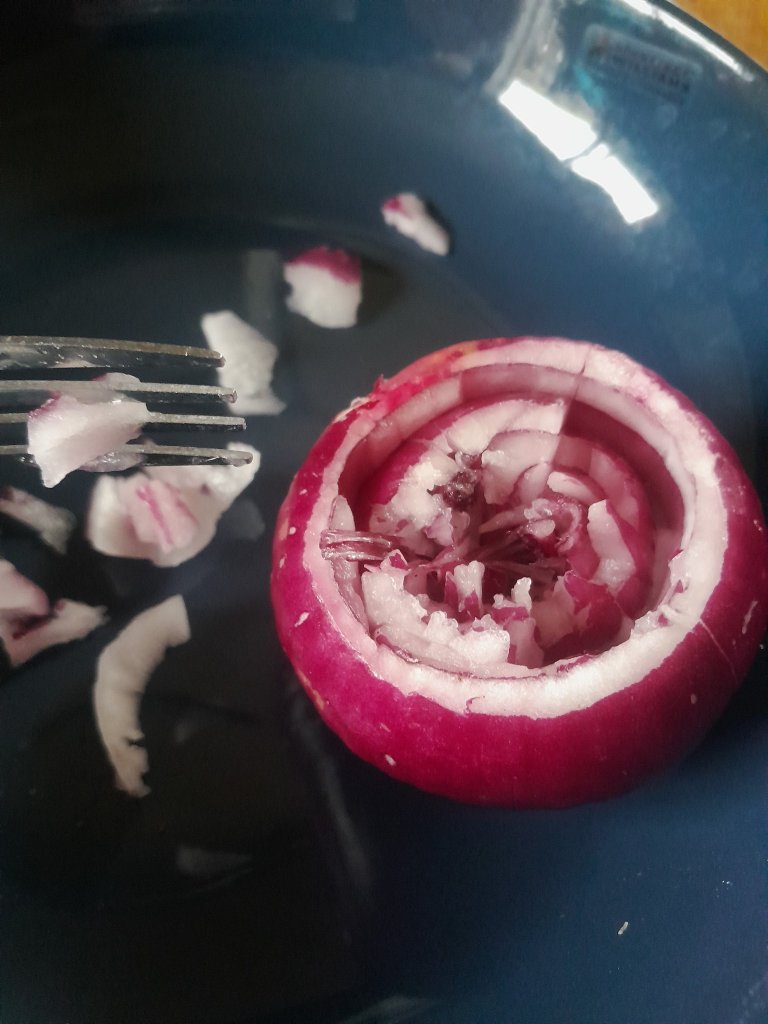 Carefully make cuts to the internal portion of the onions and then use a fork to scoop out the onion until the sides are approx 1 cm thick.