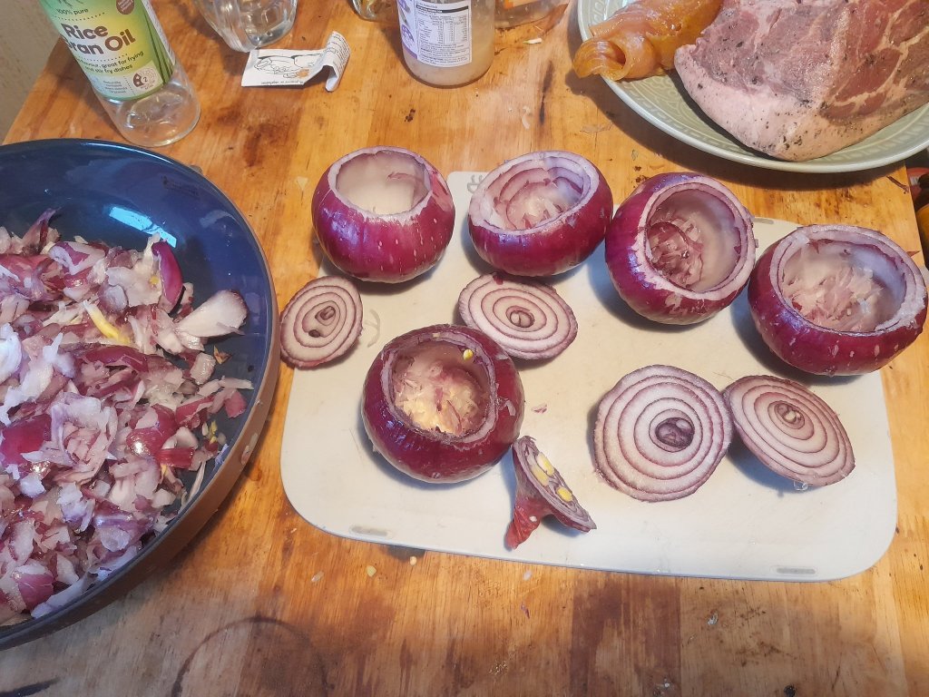 Fill the 8 onions, fry the bacon rashes and cover each in a rasher, then pop the lid back on.