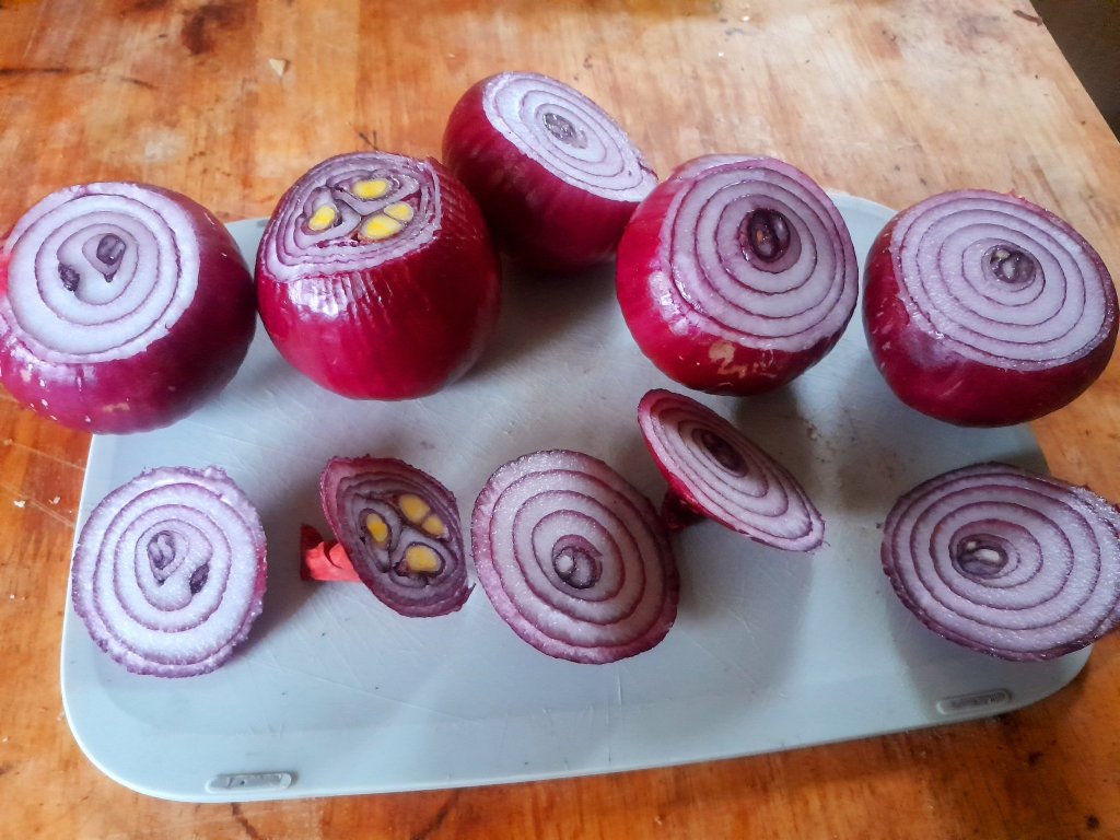 Peel the onions, cut approx. 1 cm off of the root end. I actually chose the other end as my onions sat better on the root end.