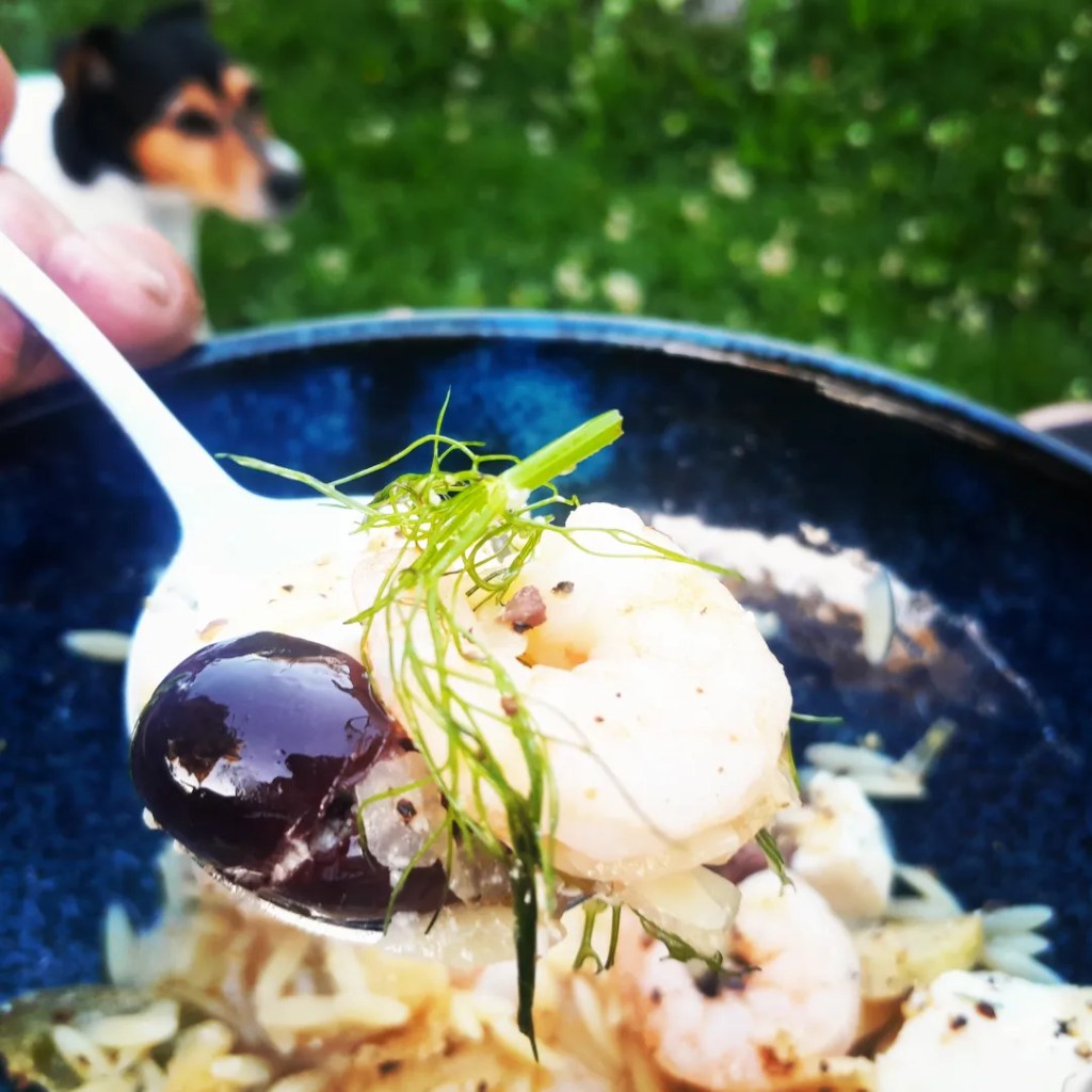 It’s interesting how Christmas Traditions start. There is something about the Pagan then Christian ritual of Christmas that seems to encourage us to do and eat and drink things in a ritualistic way as well for sustenance and hedonism. This warmed salad of prawns, feta, fennel and peppers tossed through barley shaped orzo pasta has become one of my Christmas traditions. It originated as a Cuisine Magazine recipe I would make in the summer months when I had a family. When that came to an end I was reintegrated into the wider family Christmas and this Mediterranean influenced summer salad seemed to suit our Southern Hemisphere Christmas so I started making it as my contribution to the feast. I added to the original recipe , feta capers and olives were not in the original and I pimped it on occasions with crayfish and scallops , a Christmas tradition was born.