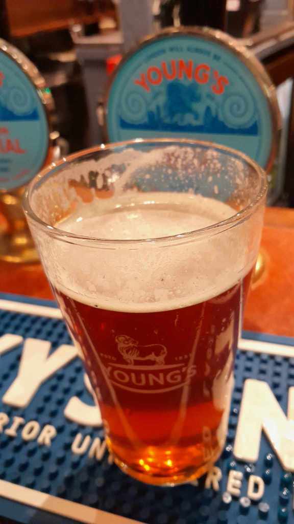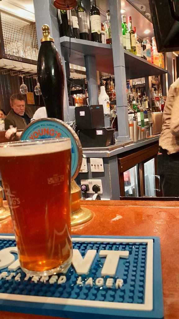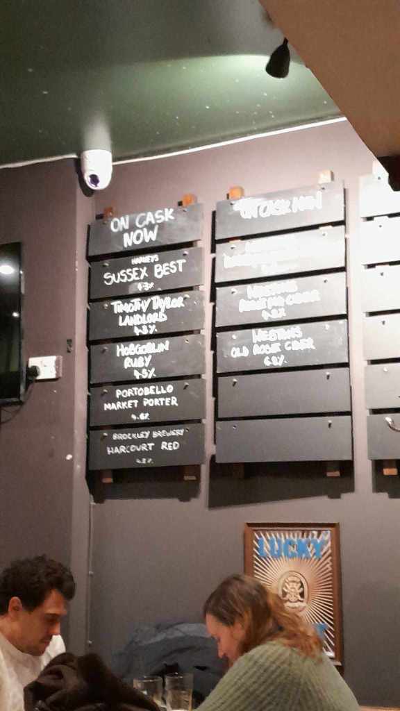 We were to meet cheese author Ned Palmer at Borough Market. Upon exiting the car of grim hostility, we made our way to The Market Porter to wait for him. It was heaving as usual. Unfortunately, the tube was down so Ned took awhile to arrive. We went for a wander around the market, and I bought some beers from the longtime beer stall Utobeer. Then we took the obligatory Lock Stock photos, found a bench to perch on till the cold got to us and found a perch at the end of the bar in The Wheatsheaf. There I had 2 pints of Youngs Special which had more than a little “Burton snatch” going on revealing it’s non-London origins these days.