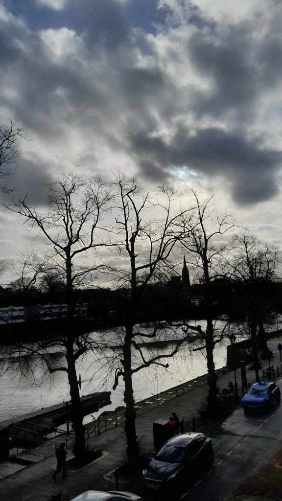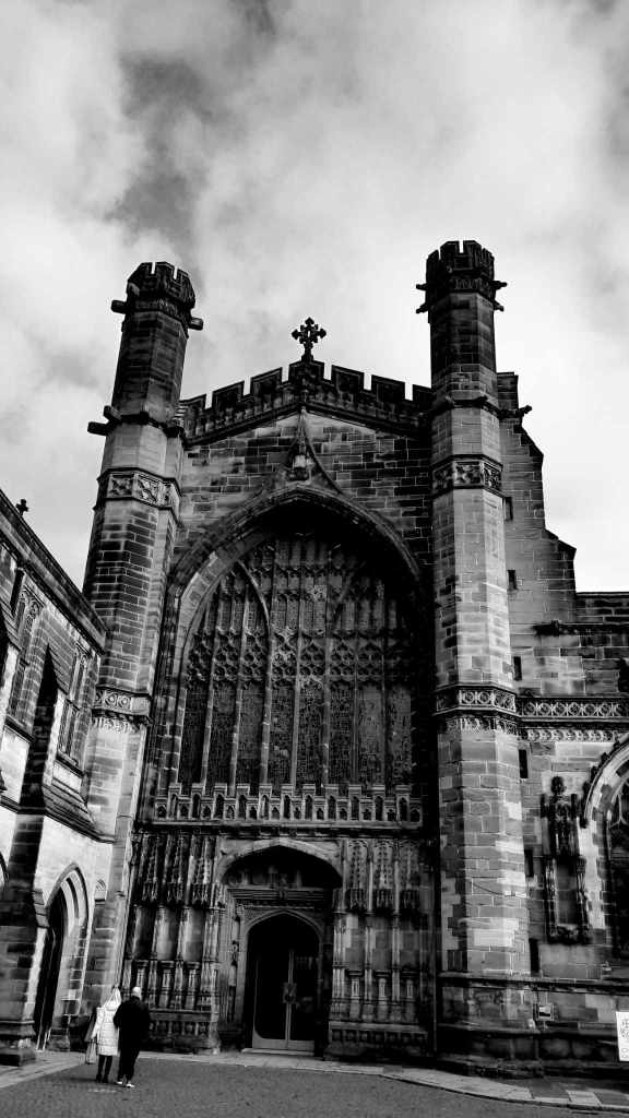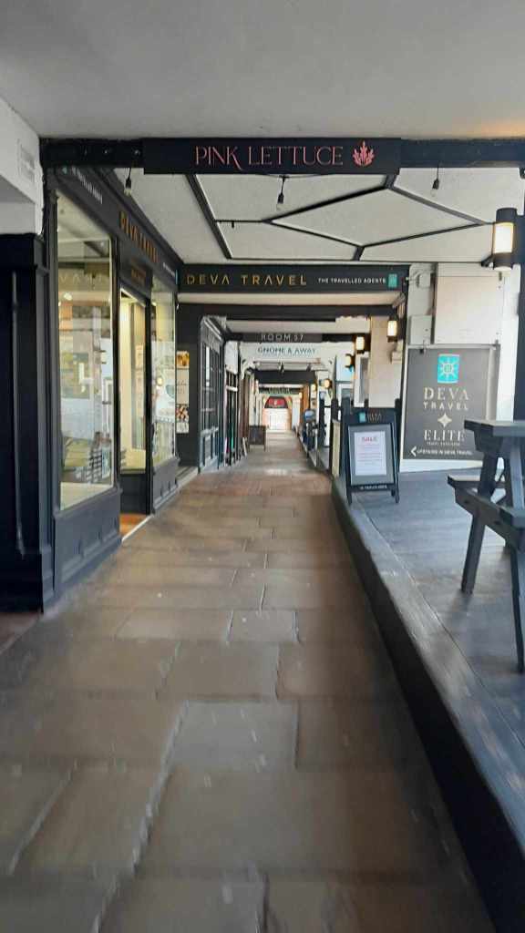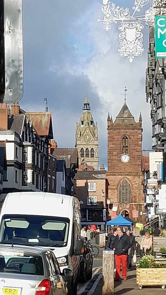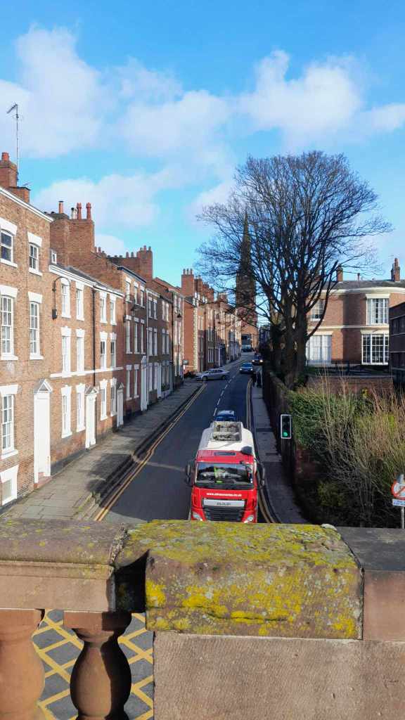 We rose late after a decent sleep in helped by the evening before’ s late finish. After cereal and tea we set off for Chester. We were to walk the Roman wall. We found a spot in Ye Olde Parking Building and headed out around town. We explored The Rows which are medieval double decker shopping lanes. Basically, there are shops at street level and a second street front on top of the roofs of the shops below. We found a café for some brunch and had coffee, toasted sandwiches , omelets and chips. We then wandered across to the edge of the old town at the back of the cathedral and mounted the old Roman wall. This wall is mostly intact, and we set off along the raised up fortification. When we reached the Roman Gardens, we came across groups of school children who were on some ‘active learning day’ and were being drilled by gentlemen dressed as Roman legionnaires. They were formed into squads , each holding a padded floppy sword like protrusion and a plastic shield. The legionnaires were having a ball whacking the hell out of the kids as they crouched beneath their shields in formation. Much shouting, and excitement ensued.