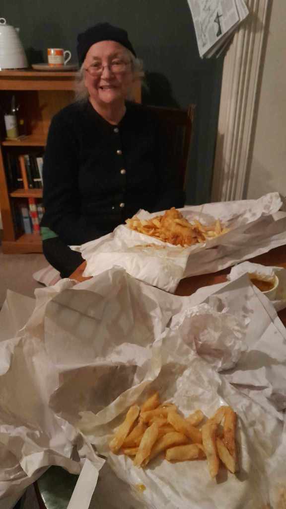 Anyway, I decided I would expose mum to the English fish and chip experience. The chippie was around the corner from The Prince Albert. Despite being Hebden Bridge this wasn’t some posh tourist aimed middle class chippie. It was full of Yorkshire accents broader than a sword and tongues just as sharp. Upon entering the stern wee woman holding court announced “my fryer is on a break so there will be a wait”. This news was met with incredulous consternation by all but mum and me. I ordered fish and chips and a meat and potato pie (because you have to order the weird stuff) and curry sauce. As we left the queue that had formed to order did not want to yield to let us escape. Elbows as sharp as picks were jostling for prime position. Mum got the full experience. We went to the Prince Albert hoping to be able to eat there but I asked as I bought the pints and was told we were welcome to eat brought in food but not fish. We sat by the fire were men with dogs sat conversing. One of them went to the gents and some people came in and managed to accidentally step on the paw of one of the border terriers that was tucked under the table. A yelp was emitted but no real damage inflicted. I said to the man upon his return “that is the problem with having such well-behaved dogs, people don’t even see them”