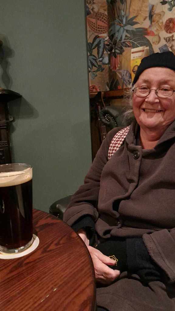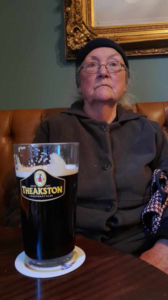 We first popped into the Old Gate but it was doing a cranking lunchtime trade and there wasn’t an inside seat to be had. We continued through town and popped into The Prince Albert. A wet led pub tucked into a back street run by a family: we heard the young barmaid tell a caller “way ya go then, just pop upstairs un see my ma”. I ordered a pint and a ½ of Old Peculier and crisps, poppadoms and scratchings. Up until now mum had been drinking 1/2s. This was the first beer to cause her to ask for a full pint straight after her 1/2.