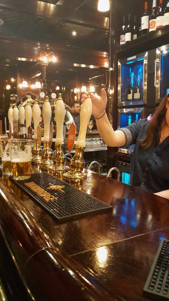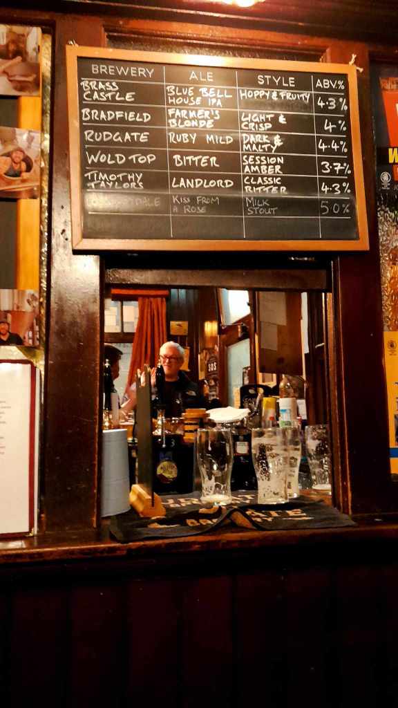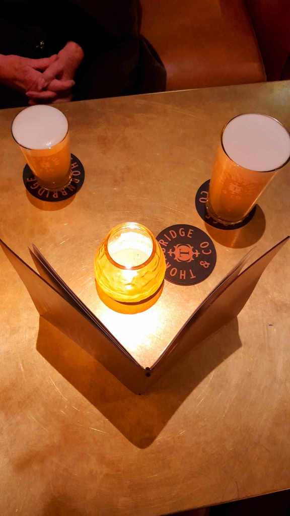 We moved on in search of food. Wandering through the tiny lanes we came across what is known as The Shambles. These are tiny lanes from the middle ages where the buildings all lean out towards each other closing over one like the trees in a forest. We came across the town market and there we found the Thornbridge pub the Market Cat. We found a table and pizza and pints were ordered. Both beer and food was excellent. Unsurprisingly this was a more modern pub and being a Friday it was busy. Mum mentioned that this seemed a lot more like the pubs back home and she wasn’t wrong. As we were eating a group of 20 something year old Sikh gentlemen walked in, “over here pal!” one of them shouted motioning to a piece of vacant bar real-estate in a broad Bradford accent. Boots hit the brass runner; pints appeared along the bar.