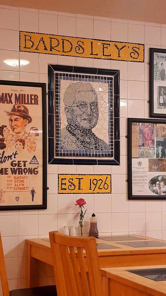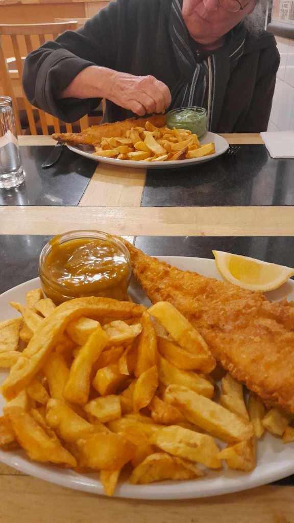 One of the reasons for coming to Brighton was to give English fish and chips one last go. After much research I settled on Bardsley’s which had been frying since 1926. We ate in the dining room where a suited gent also was dining, a wee dog at his foot. The fish and chips were good, and I tried a cods roe fritter which was interesting, kind of like tinned tuna deep fried. So yes, decent fish and chips can be found in Britain, if you eat in so they cook them fresh and avoid the dreaded warmers, and if you pay $100 NZ for them (including a beer).